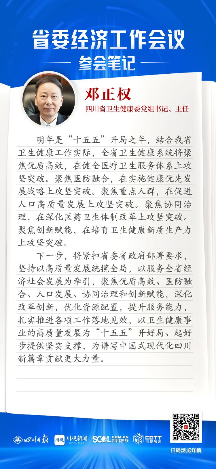 明年是“十五五”開局之年,結合我省衛(wèi)生健康工作實際,全省衛(wèi)生健康系統將聚焦優(yōu)質高效,在健全醫(yī)療衛(wèi)生服務體系上攻堅突破,建立醫(yī)療衛(wèi)生資源動態(tài)調整機制,推進優(yōu)質醫(yī)療資源擴容下沉和區(qū)域均衡布局;聚焦醫(yī)防融合,在實施健康優(yōu)先發(fā)展戰(zhàn)略上攻堅突破,到2030年,人均預期壽命達80歲左右;聚焦重點人群,在促進人口高質量發(fā)展上攻堅突破,強化生育和育幼服務支持,研究制定生育休假成本分擔政策,加快構建以托育綜合服務中心為樞紐的“1+N”托育服務體系;聚焦協同治理,在深化醫(yī)藥衛(wèi)生體制改革上攻堅突破,爭取更多國家級試點示范落地四川;聚焦創(chuàng)新賦能,在培育衛(wèi)生健康新質生產力上攻堅突破,實施醫(yī)防管交叉復合型戰(zhàn)略人才培養(yǎng)工程,推廣遠程醫(yī)療、醫(yī)學人工智能輔助診斷,2030年實現高精尖醫(yī)療技術和基層醫(yī)療服務水平全國一流、西部領先。