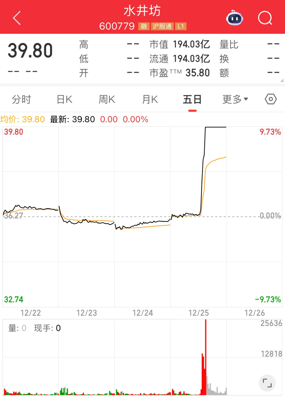 12月25日下午一點多,水井坊股價突然直線拉升,后直接以漲停收盤,領漲整個白酒板塊。
