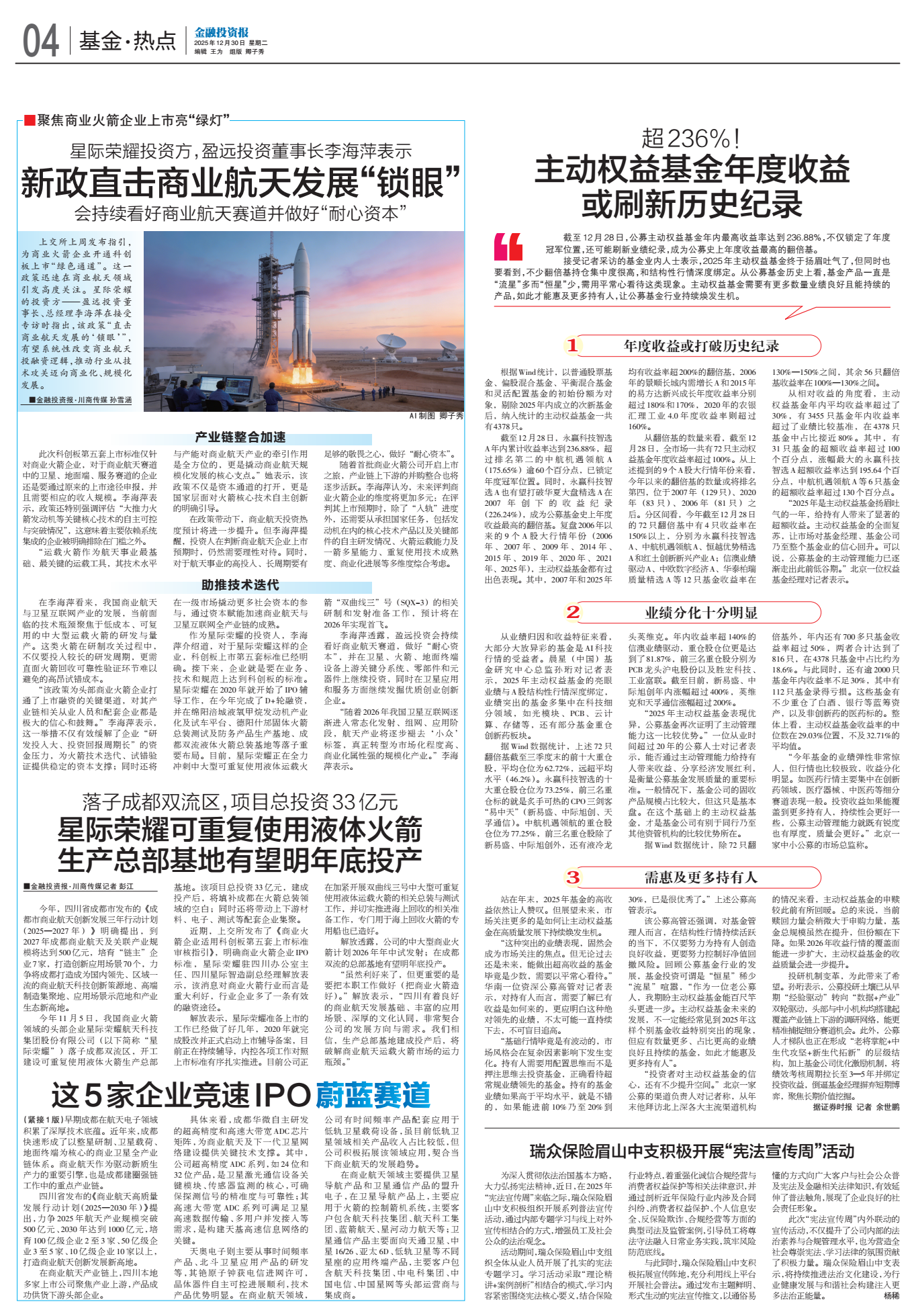 解放表示,星際榮耀準備上市工作已經好幾年,2020年就做完股改并正式啟動上市輔導備案,目前正在持續輔導,內控各項工作對照上市標準,有序扎實推進。目前公司正在加緊開展雙曲線三號中大型可重復使用液體運載火箭的相關總裝、測試工作,也切實推進海上回收的相關準備工作,專門用于海上回收火箭的專用船已造好。