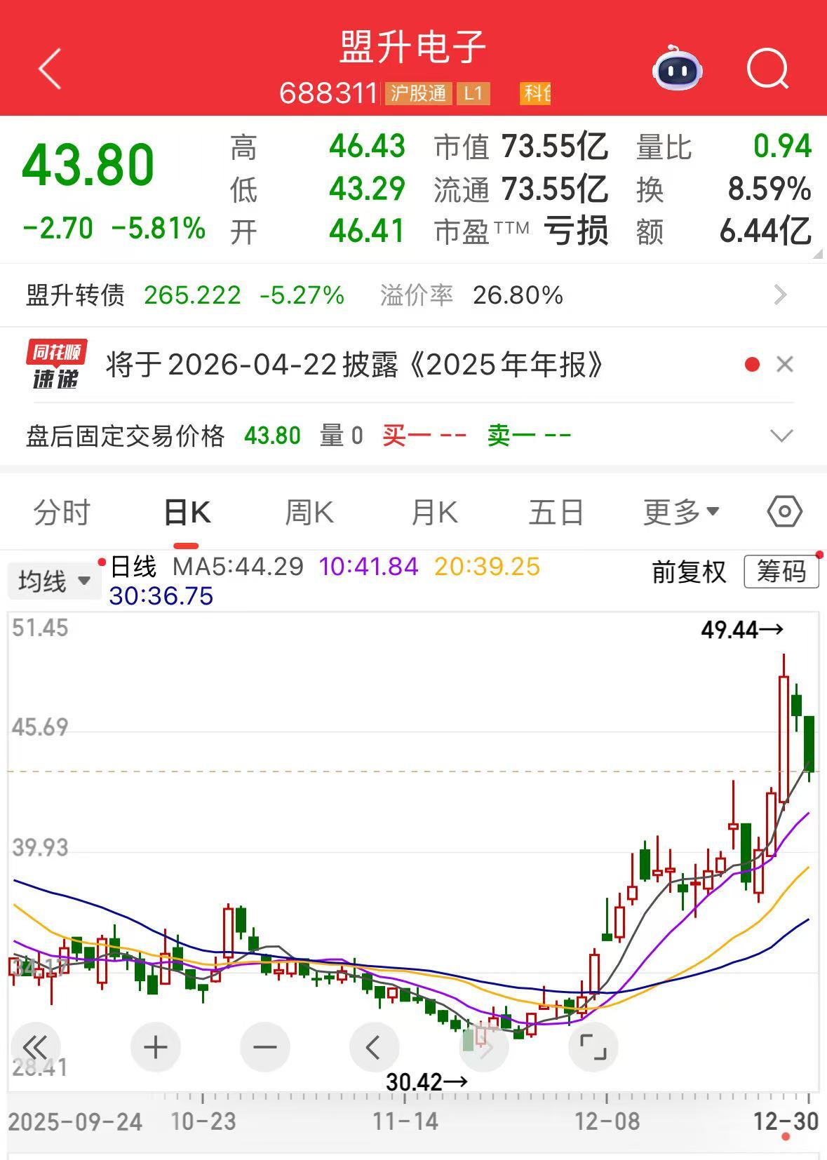 二級市場上,截至12月29日收盤,盟升電子報43.80元/股,總市值73.55億元。