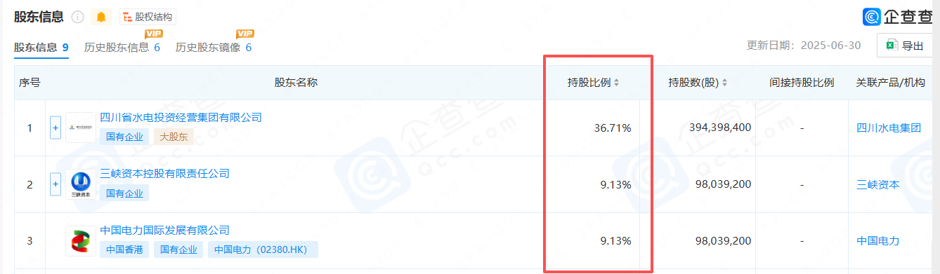 股權結構中,前三大股東分別為四川省水電投資經營集團有限公司(持股36.71%)、三峽資本控股有限責任公司(持股9.13%)和中國電力國際發展有限公司(持股9.13%),公司的最終實際控制人為四川省國資委。
