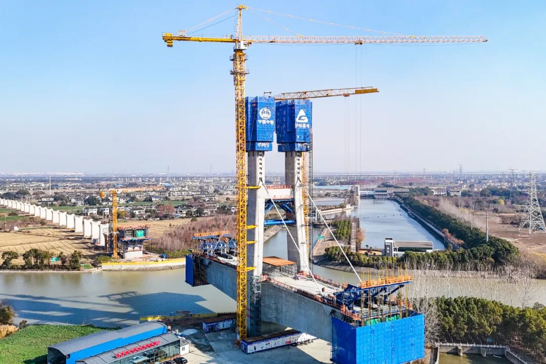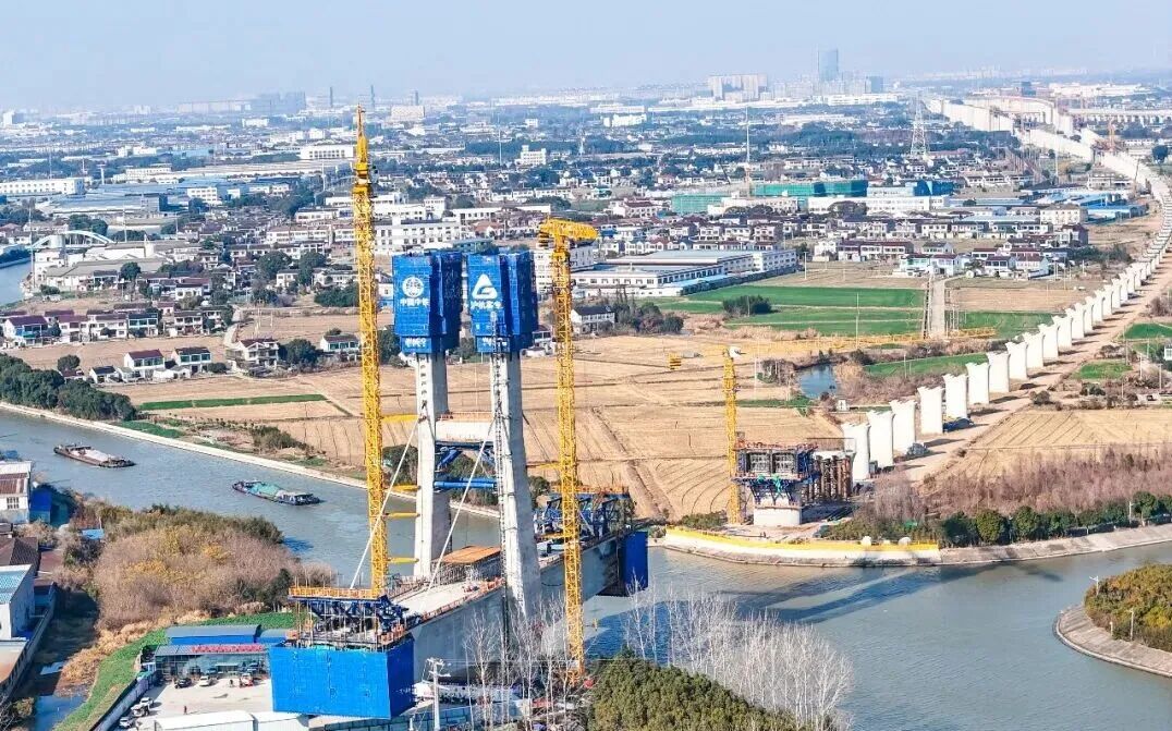 該橋橫跨張家港河、走馬塘河,采用獨塔雙索面預應力混凝土矮塔斜拉橋設計,全長417.7米,采用(43.1+2x165+43.1)米的跨徑布置,橋面以上塔高49.25米;該橋采用墩塔梁固結體系,主塔橫橋向呈H形,主梁為預應力混凝土結構,橋塔和剛臂主墩采用鋼筋混凝土結構,斜拉索采用扇形布置。自2024年10月11日首根樁基開鉆以來,項目團隊克服工期緊張、結構復雜、高空作業風險高等多重挑戰,在15個月內高效完成了樁基、承臺、墩柱至塔身封頂的全工序施工。