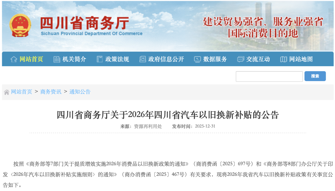 12月31日晚,四川省商務(wù)廳發(fā)布了《四川省商務(wù)廳關(guān)于2026年四川省汽車以舊換新補(bǔ)貼的公告》《四川省商務(wù)廳關(guān)于實(shí)施2026年家電以舊換新、數(shù)碼和智能產(chǎn)品購(gòu)新補(bǔ)貼政策的公告》。