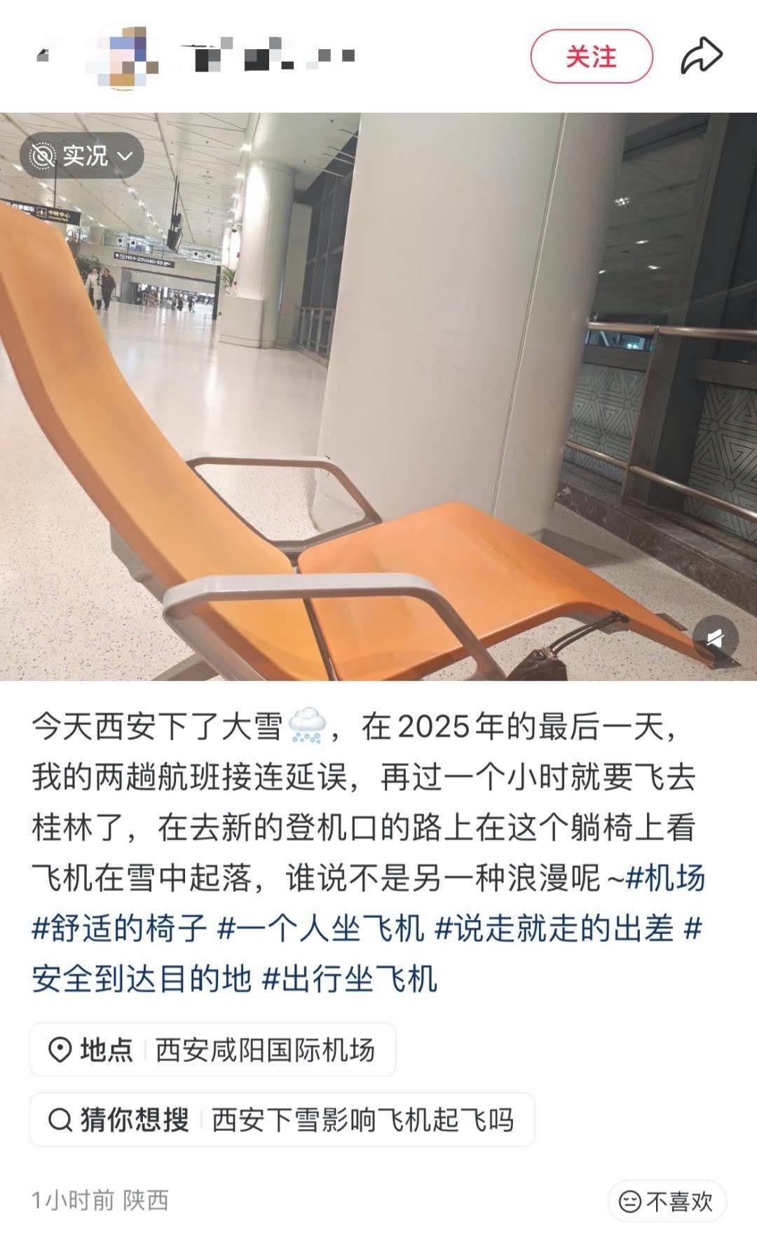 當天,受今冬首場降雪影響,咸陽機場多趟航班延誤或取消。社交平臺上,不少旅客反映遭遇長時間滯留,有人甚至被迫在機場過夜,出行計劃被打亂。