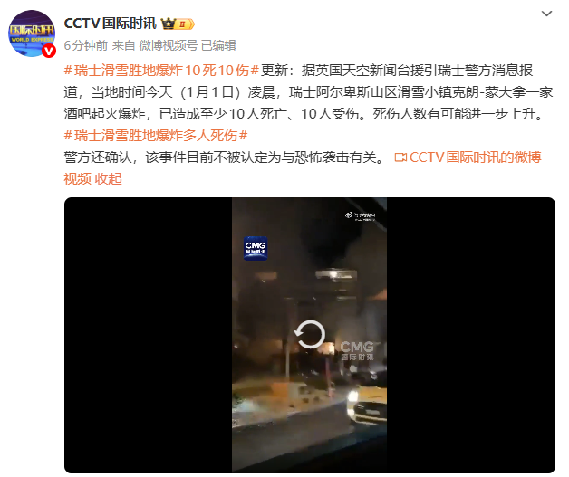 據英國天空新聞臺援引瑞士警方消息報道,當地時間今天(1月1日)凌晨,瑞士阿爾卑斯山區滑雪小鎮克朗-蒙大拿一家酒吧起火爆炸,已造成至少10人死亡、10人受傷。死傷人數有可能進一步上升。
