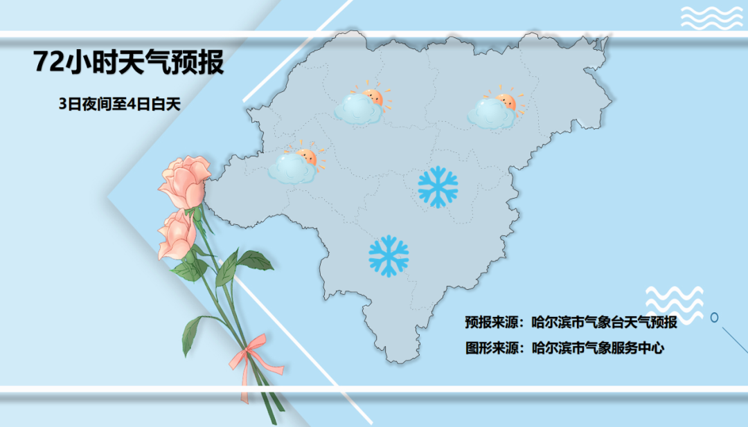 3日夜間至4日白天:全市晴轉多云,其中4日白天方正、延壽、尚志、五常東部有零星陣雪;西南風2~4級;最低氣溫木蘭、通河-25~-23℃,其他區域-22~-19℃,最高氣溫-12~-11℃。