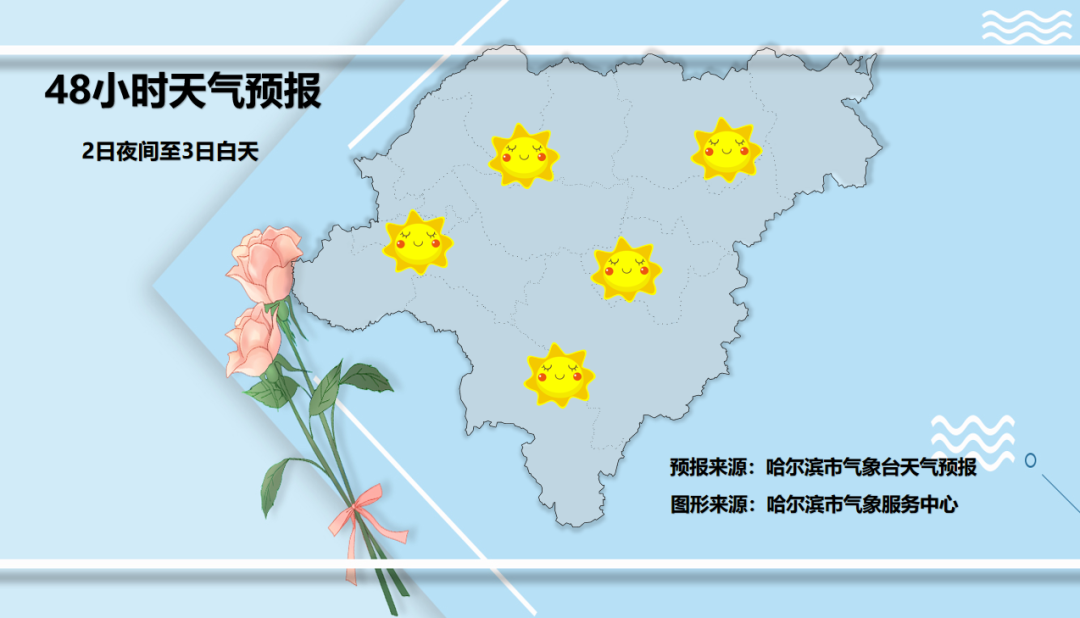 2日白天全市晴間多云;偏西風轉西南風1~2級;最低氣溫呼蘭、木蘭、通河-30~-27℃,其他區域-26~-24℃,最高氣溫-17~-14℃。