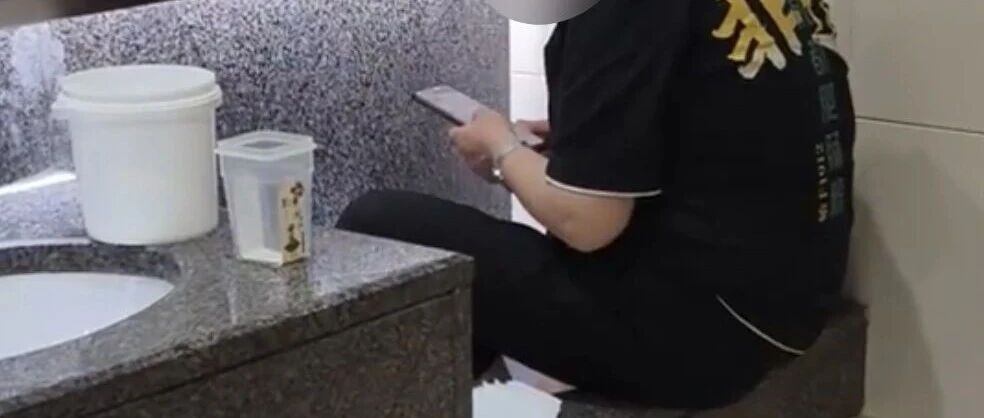 從博主發布的視頻來看,該工作人員身穿“非遺成都肥腸粉”的工裝,直接坐在衛生間的兒童洗手池上,并將腳伸進洗手盆中。