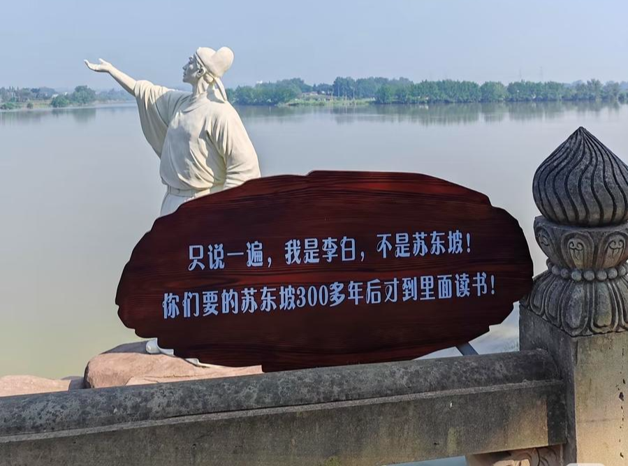 該提示牌立在四川省眉山市青神縣中巖景區(qū)的李白雕像前,全文為:“只說(shuō)一遍,我是李白,不是蘇東坡,你們要的蘇東坡300多年后才到里面讀書!”