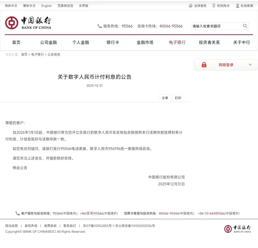 12月31日,中國銀行、工商銀行、農業銀行、建設銀行、交通銀行、郵儲銀行六家國有大行相繼發布公告稱,2026年1月1日起,將為開立在該行的數字人民幣實名錢包余額按照該行活期存款掛牌利率計付利息,計結息規則與活期存款一致。