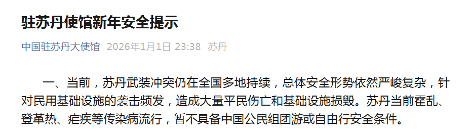 當地時間2026年1月1日,中國駐蘇丹大使館發布安全提示,再次提醒中國公民近期暫勿前往蘇丹。