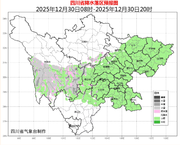據四川氣象消息,今天晚上到明天白天:盆地各市陰天有小雨,高海拔山區有雨夾雪或小雪,局地中到大雪,其中達州、廣安、瀘州3市和巴中、南充2市東部的部分地方有中雨;甘孜州東部南部、阿壩州東部和涼山州東北部陰天間多云有陣雪(雨),局地中雪,川西高原和攀西地區的其余地方多云間晴。