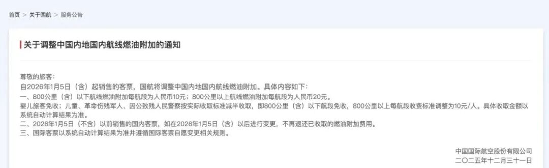 東方航空、南方航空和中國(guó)國(guó)際航空近日發(fā)布通知,自2026年1月5日(含)起銷(xiāo)售的客票,調(diào)整國(guó)內(nèi)航線旅客運(yùn)輸燃油附加費(fèi)征收標(biāo)準(zhǔn)。
