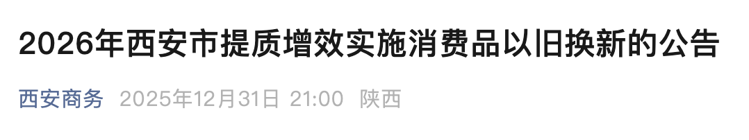 根據國家和陜西省消費品以舊換新工作部署,現就2026年西安市提質增效實施消費品以舊換新相關工作公告如下: