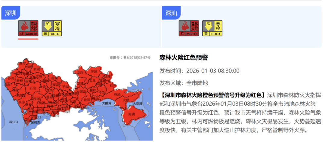 深圳市森林防滅火指揮部和深圳市氣象臺2026年1月3日08時30分將全市陸地森林火險橙色預警信號升級為紅色,預計深圳天氣將持續干燥,森林火險氣象等級為五級,林內可燃物極易燃燒,森林火災極易發生,火勢蔓延速度極快,有關主管部門加大巡山護林力度,嚴格管制野外火源。