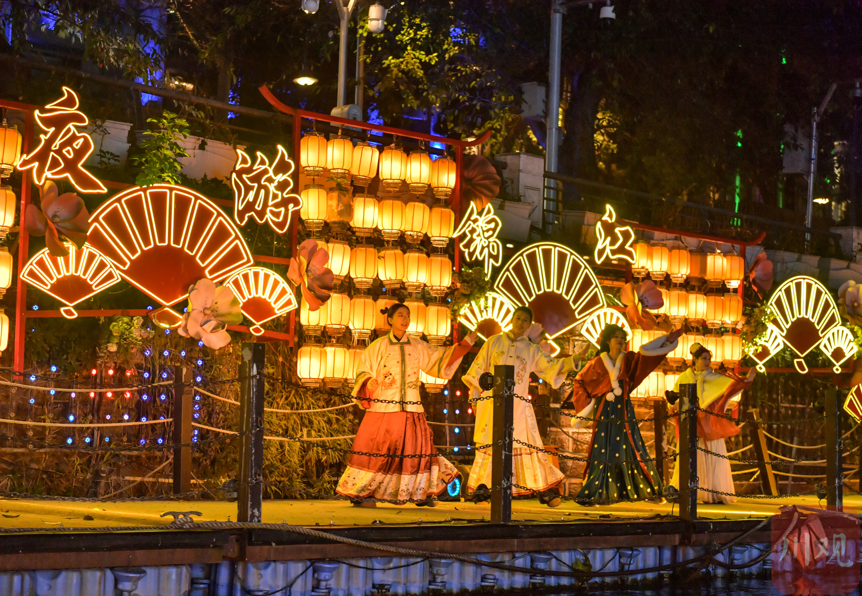 錦江河岸邊的演員為乘坐游船的游客表演節目。