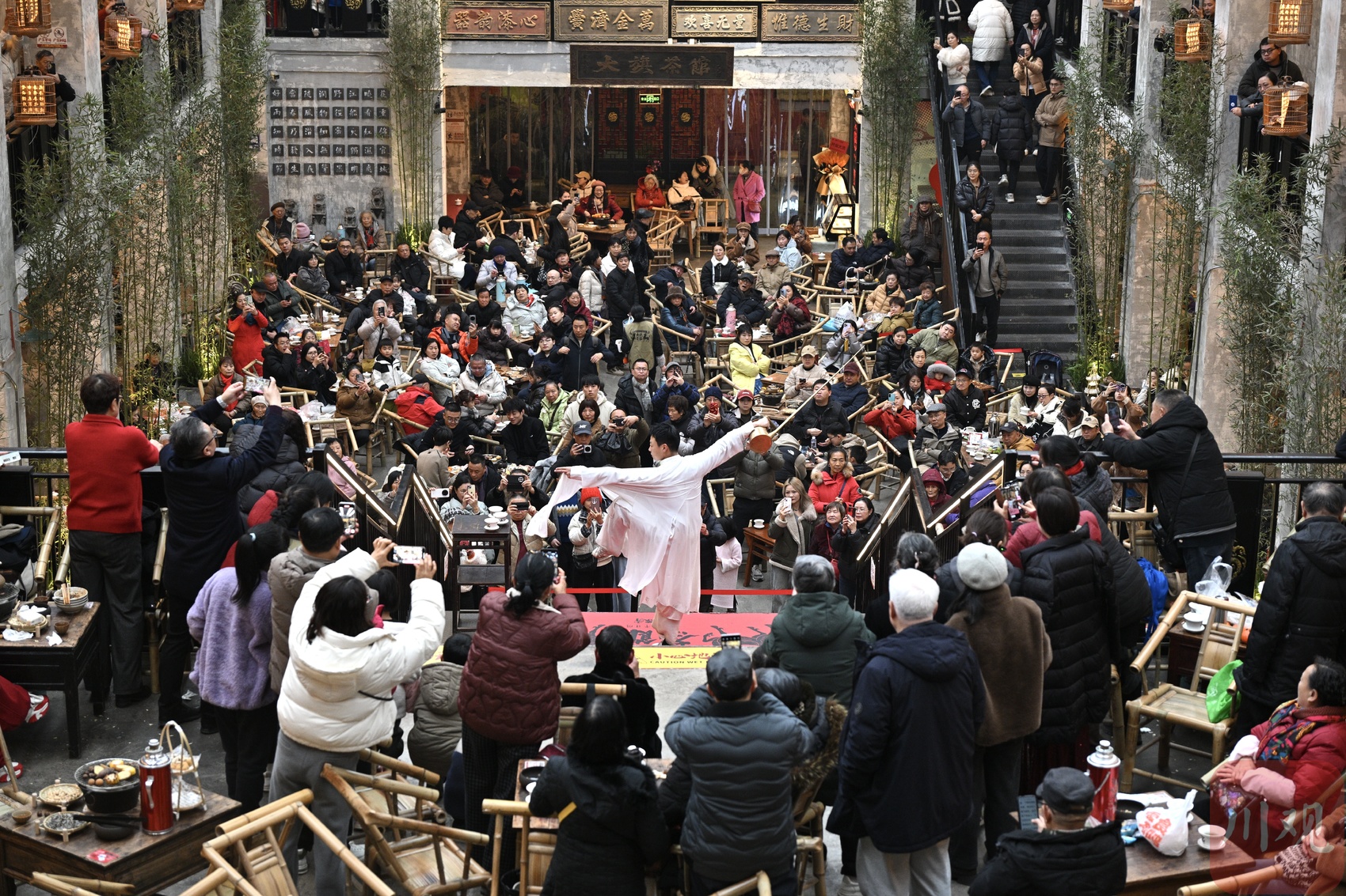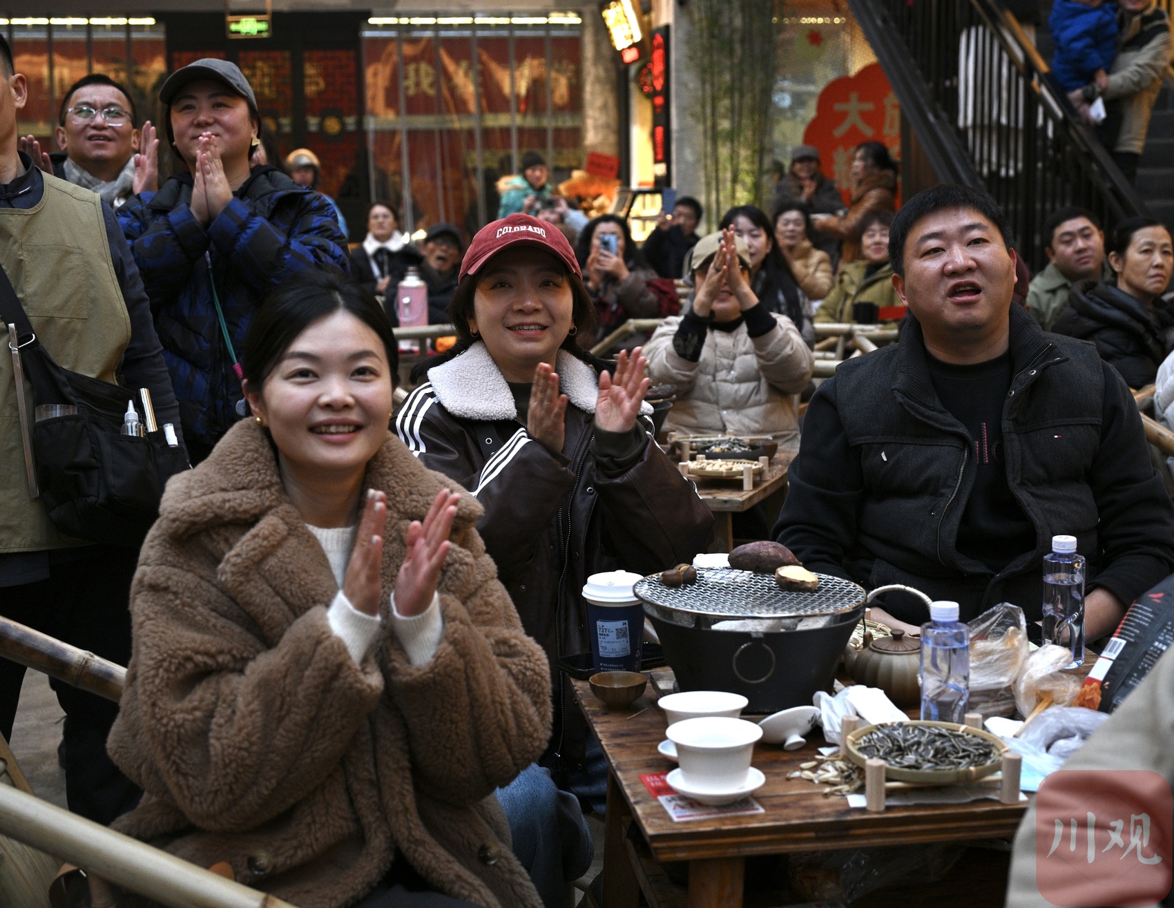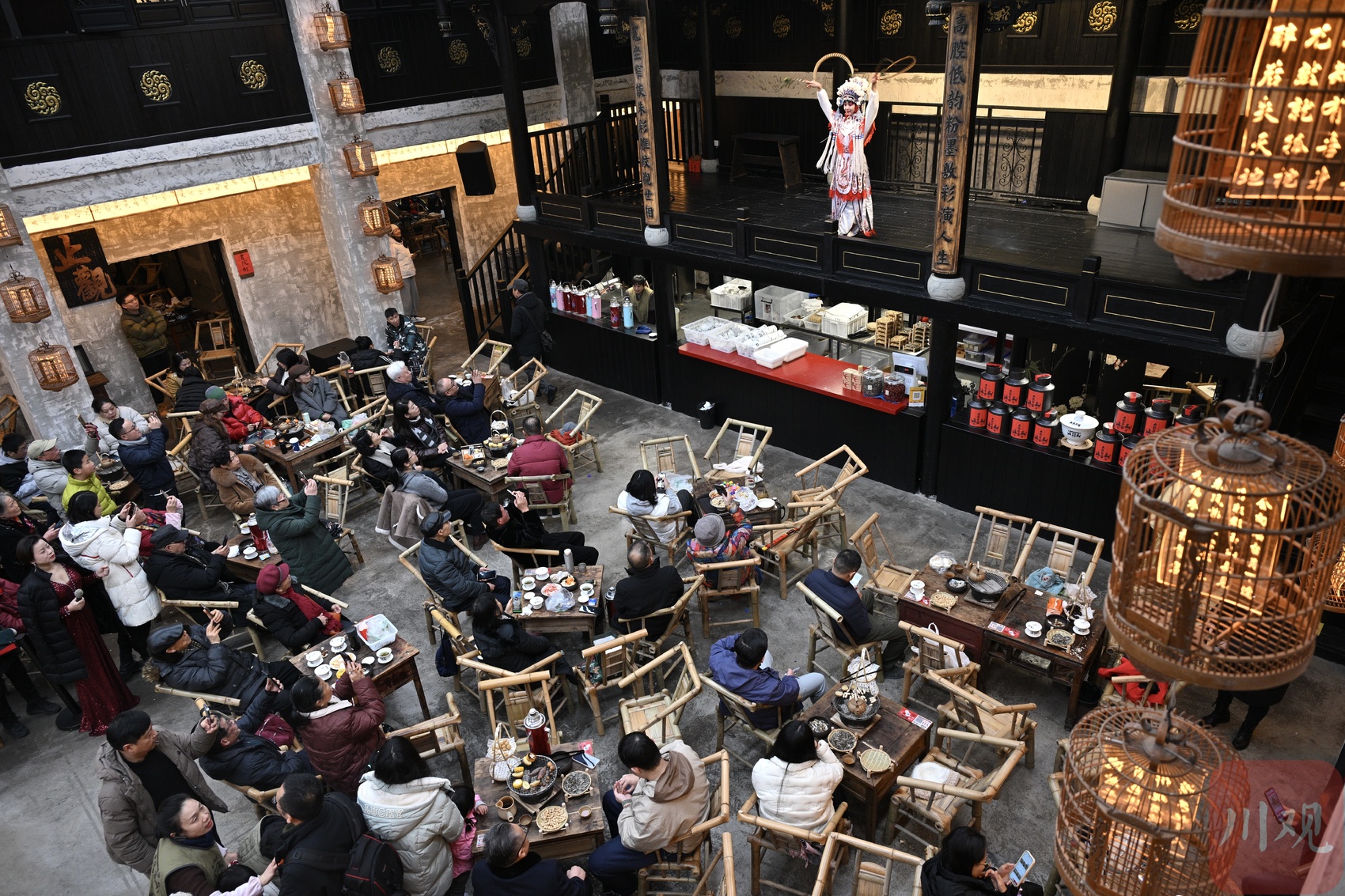 1月3日下午,成都大旗茶館內(nèi)人聲鼎沸、熱鬧非凡,悠揚(yáng)的川劇唱腔與清脆的蓋碗茶碰擊聲交織,吸引了大批本地市民和外地游客前來(lái)打卡體驗(yàn),樂(lè)享元旦假期。