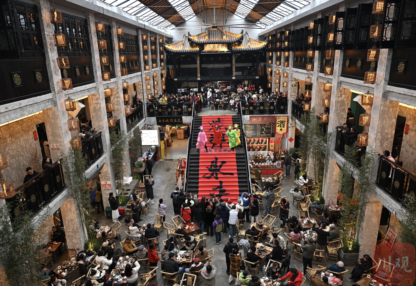 這座茶館的前身是成都漆器工藝廠的閑置老廠房。經(jīng)過(guò)一番“爆改”,老廠房褪去了工業(yè)時(shí)代的厚重感,搖身一變成為集喝茶、美食、民俗表演于一體的復(fù)合型文化新空間。