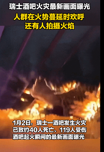 瑞士酒吧新年夜大火目前已造成至少40人喪生。2日,調查人員公布結果,火災確系香檳瓶里的煙花棒引發。調查人員從現場視頻發現,有人高舉酒瓶,煙花棒因過于靠近酒吧天花板而引發火災。