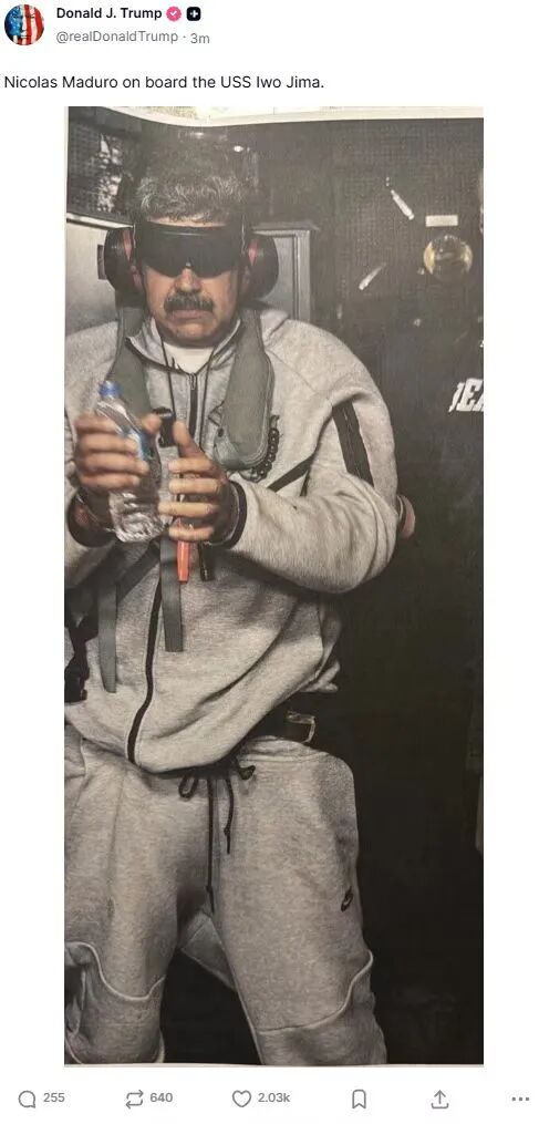 當(dāng)?shù)貢r間1月3日,特朗普在其社交平臺Truth Social上發(fā)布了一張馬杜羅在“硫磺島”號軍艦上的照片。