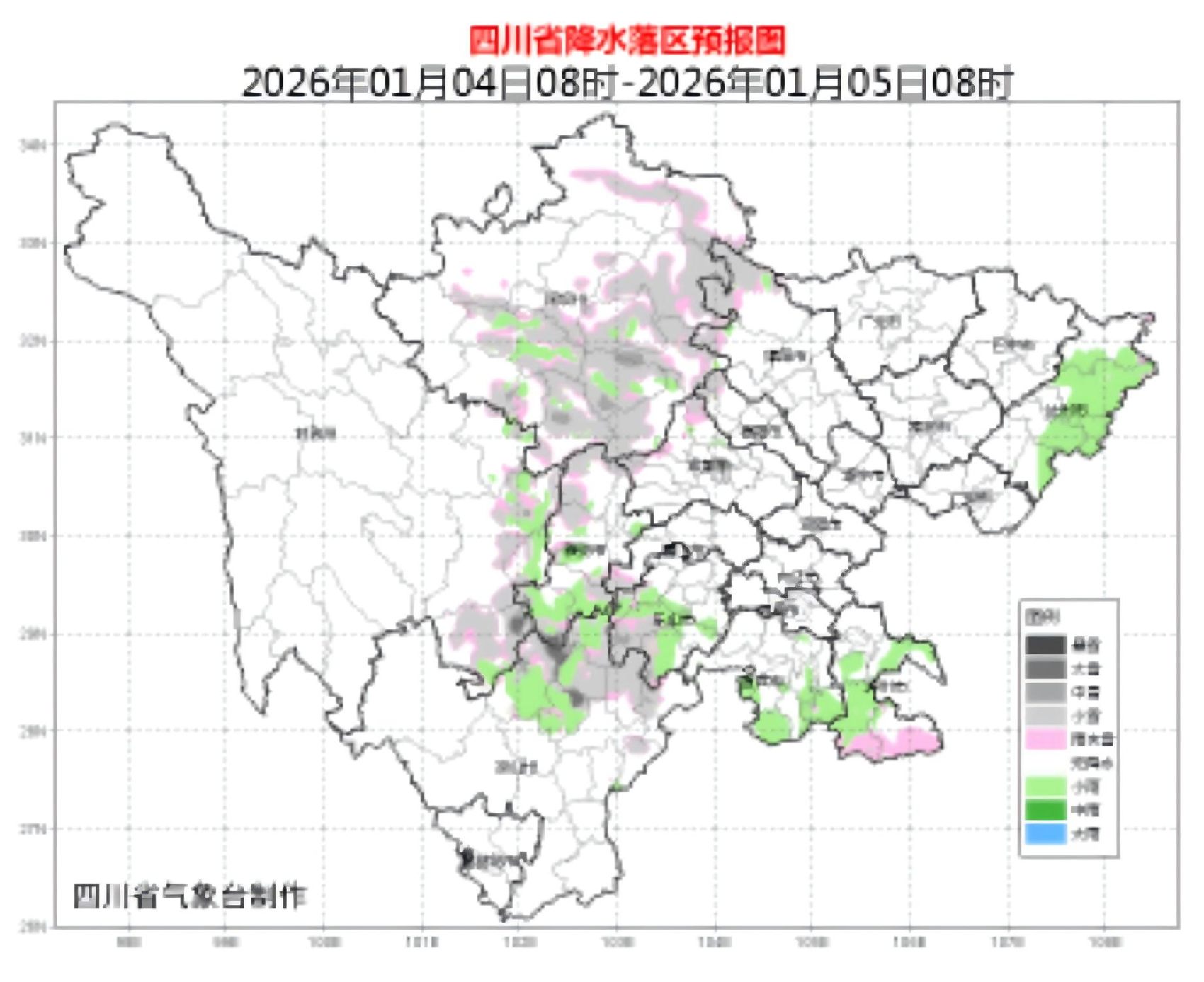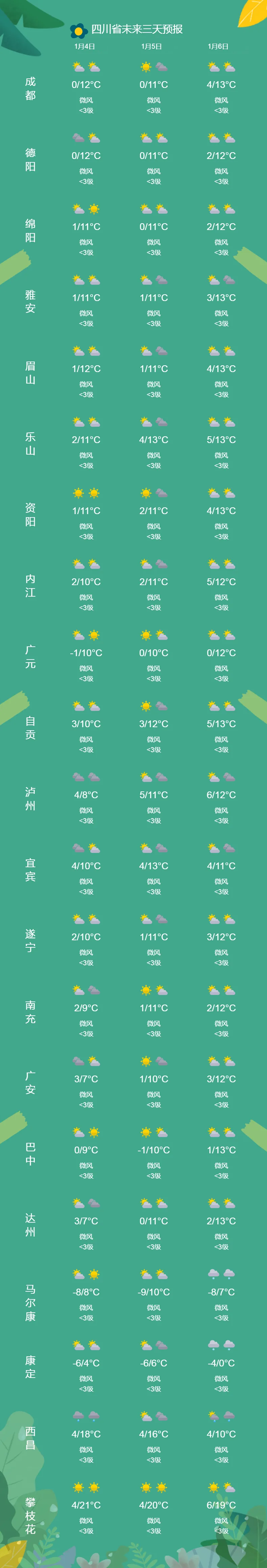 據(jù)四川省氣象臺(tái)預(yù)報(bào),1月4日至10日,盆地以多云間晴天氣為主;川西高原東部南部和涼山州北部多陣雪或陣雨,川西高原和攀西地區(qū)其余地方大部時(shí)段多云間晴。5日至7日,盆地西南部山區(qū)有小雨,高海拔地區(qū)有雨夾雪;川西高原東部南部和涼山州北部有陣雪或陣雨,局部中雪。