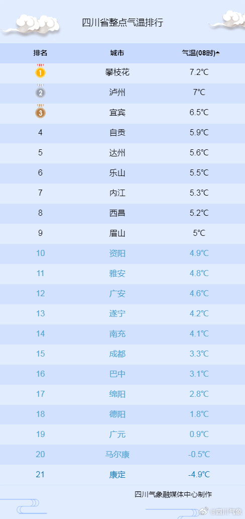 實(shí)況監(jiān)測(cè)顯示,今天8時(shí),四川全省最高氣溫為7.2℃(攀枝花),盆地最低氣溫僅0.9℃(廣元)。