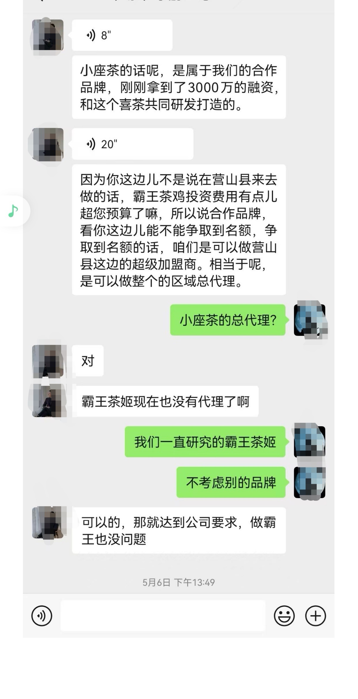 交流中,這名男子告訴他,“霸王茶姬”加盟門檻高,且已經趨于飽和,誘導他加盟旗下另一款“子品牌”。