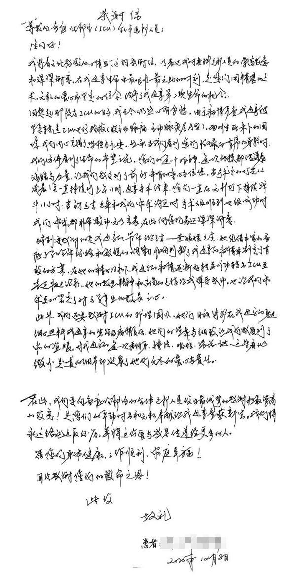 “在我母親生命中最艱難、最無助的時間,是你們用精湛的技術(shù),無私的愛心和堅定的信念,給予了我母親第二次生命”。