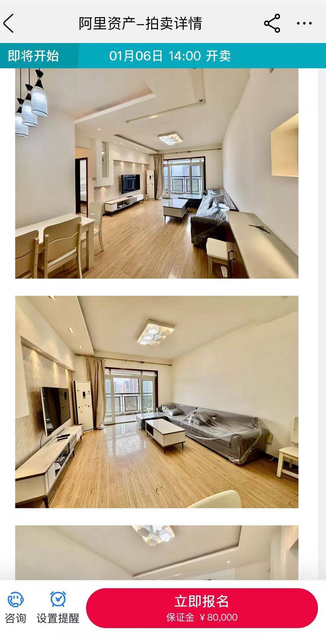 阿里資產(chǎn)平臺(tái)的信息顯示,這套房屋在1月6日14:00將再次開賣,房屋價(jià)格仍然為26.6萬元,房屋面積89.70平方米,二居室二廳一衛(wèi)戶型,為精裝修交付。