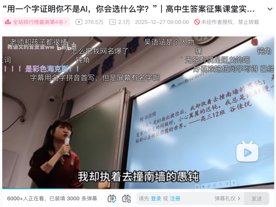 最近,一堂高中語文課的視頻引發熱議。視頻源于深圳語文老師@教語文的萱萱萱ww?的一次特別作文題征集:“如果用一個字證明你不是AI,你會選哪個?”