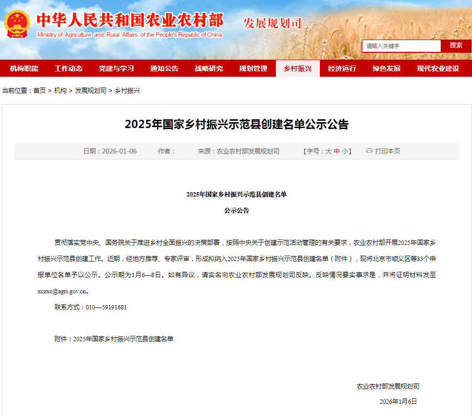 農業農村部發展規劃司公示了