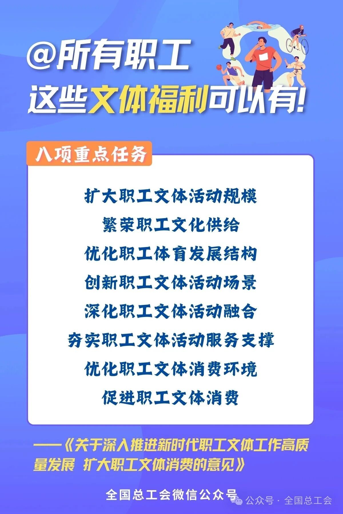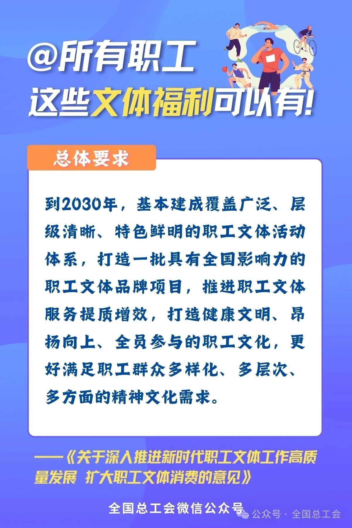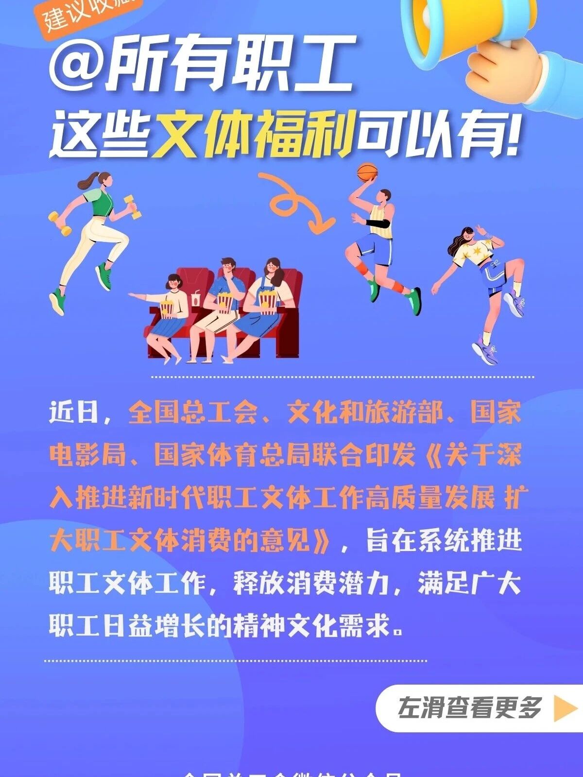 近日,全國總工會、文化和旅游部、國家電影局、國家體育總局聯合印發《關于深入推進新時代職工文體工作高質量發展 擴大職工文體消費的意見》,旨在系統推進職工文體工作,釋放消費潛力,滿足廣大職工日益增長的精神文化需求。