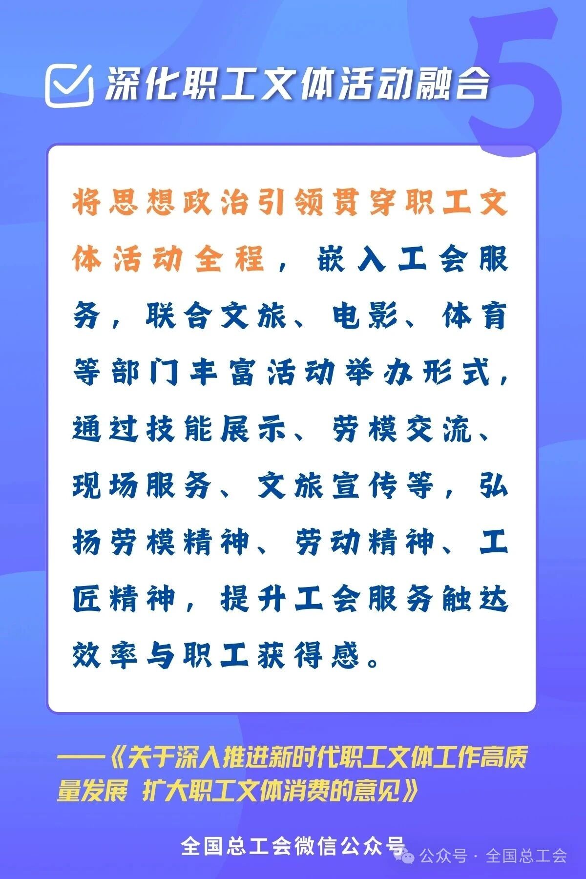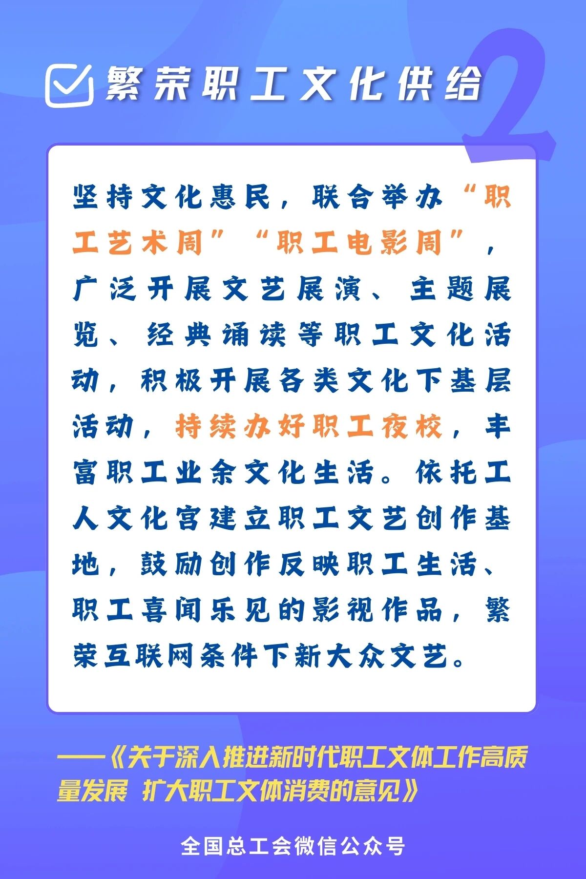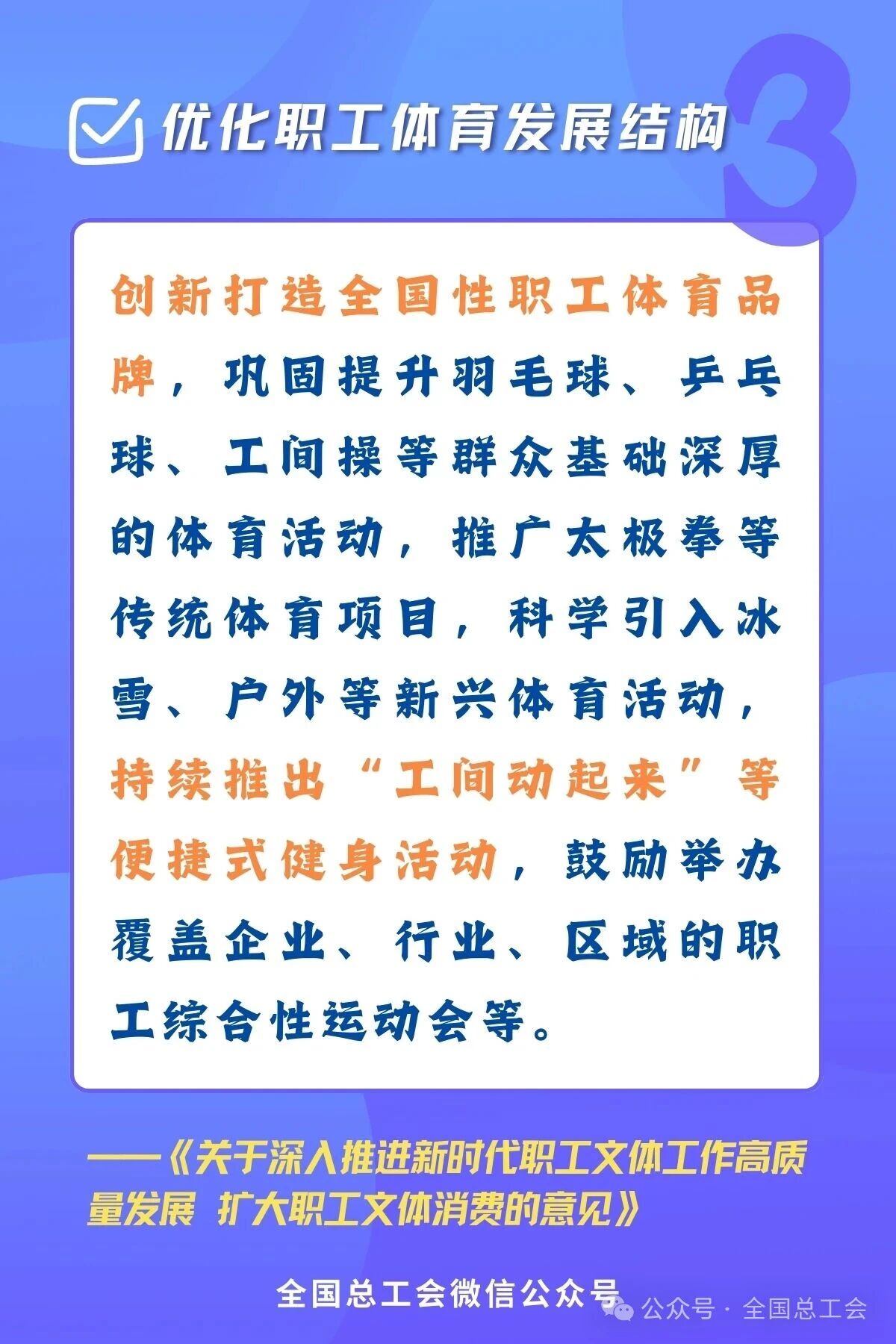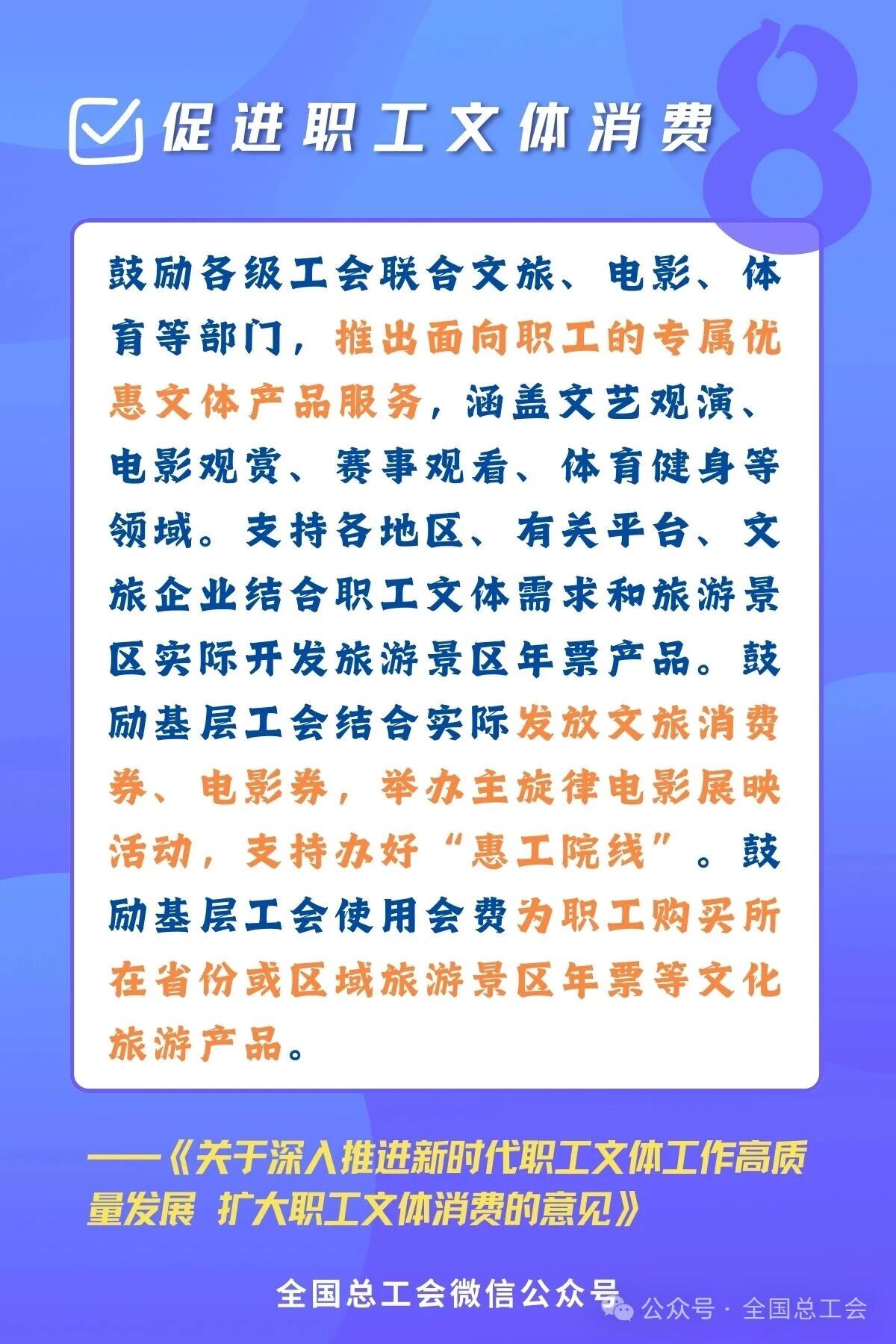 近日,全國總工會、文化和旅游部、國家電影局、國家體育總局聯合印發《關于深入推進新時代職工文體工作高質量發展 擴大職工文體消費的意見》,旨在系統推進職工文體工作,釋放消費潛力,滿足廣大職工日益增長的精神文化需求。