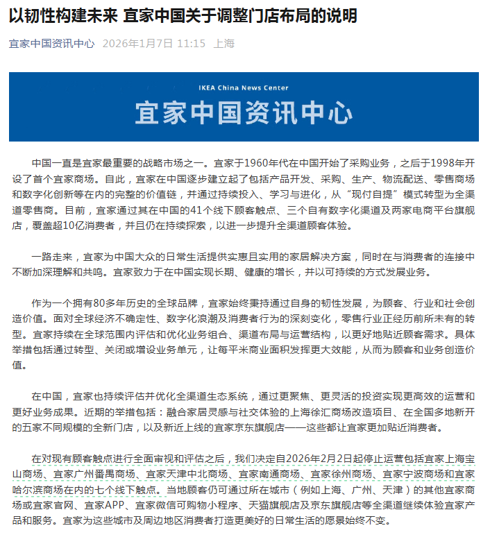 7日,據宜家中國消息,宜家中國在對現有顧客觸點進行全面審視和評估之后,決定自2026年2月2日起停止運營包括宜家上海寶山商場、宜家廣州番禺商場、宜家天津中北商場、宜家南通商場、宜家徐州商場、宜家寧波商場和宜家哈爾濱商場在內的七個線下觸點。公司稱此舉為優化渠道布局、構建業務韌性。
