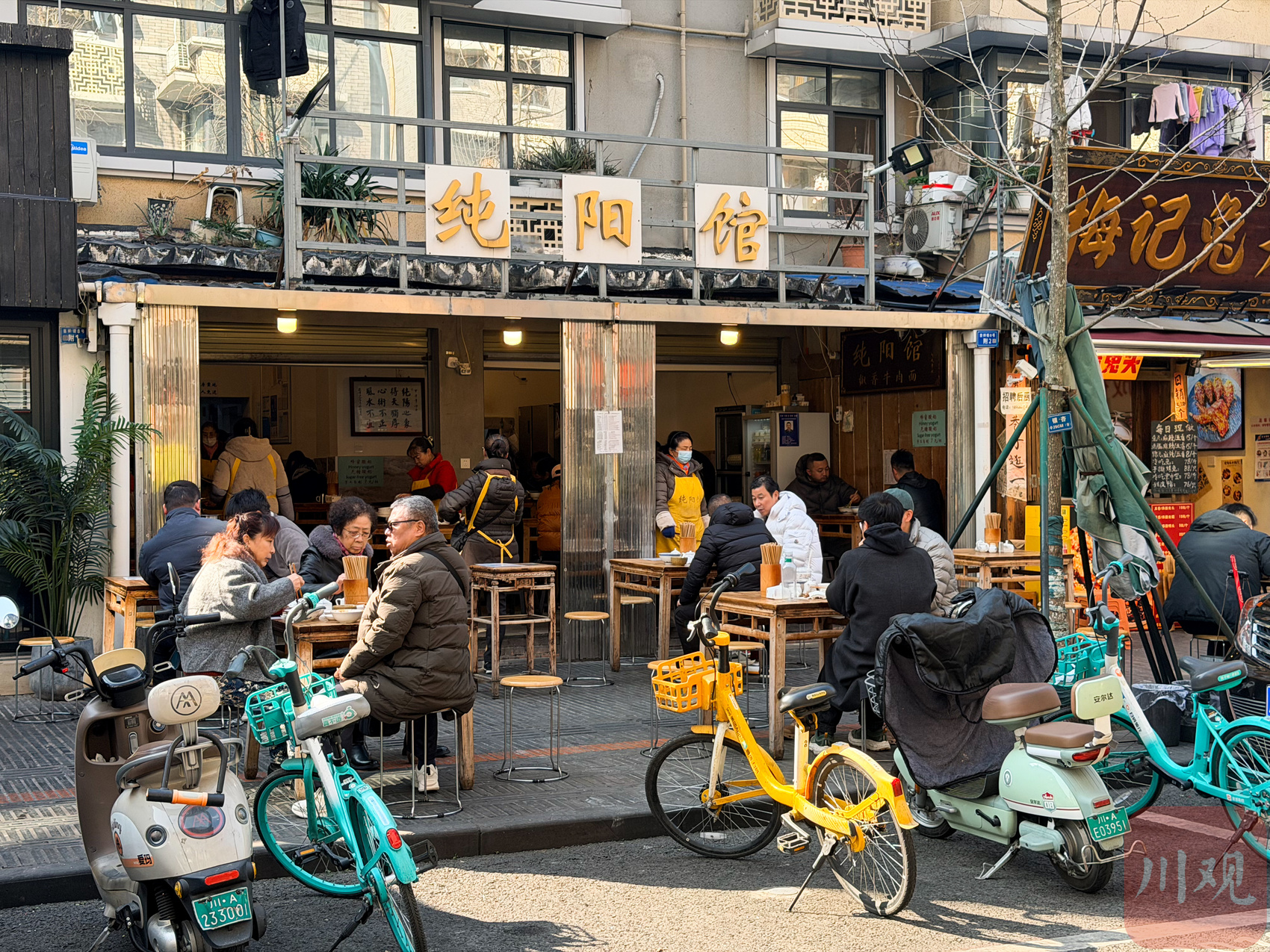 此時,同樣把門店開在餐飲門店扎堆的吉祥街上,開了22年的“純陽館”,20多張小餐桌已經(jīng)坐滿食客,街邊上還站著不少等待進店點餐的客人,16名店員全員上陣服務。這陣仗,每天都差不多。
