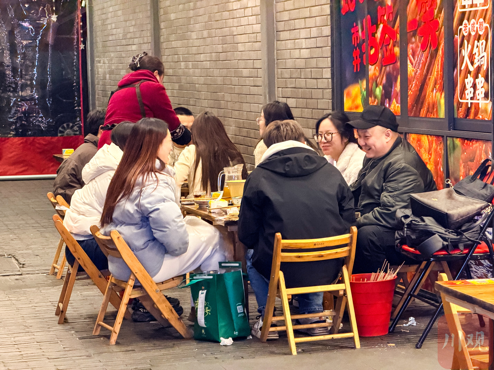 食客圍坐在一家店的街邊小餐桌上就餐,升騰的熱氣盡顯城市煙火氣。