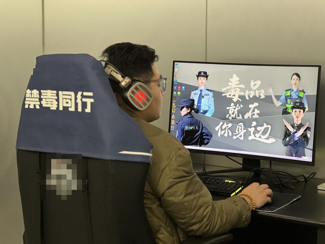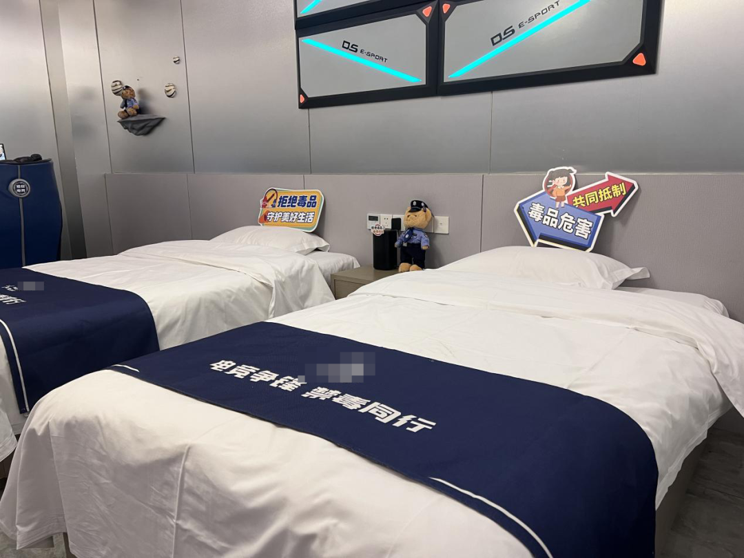 更加沉浸式的體驗則精心設計于禁毒主題客房。房間內,電腦屏保滾動播放禁毒警示動畫,定制鼠標墊上印有防毒口訣,墻面進行了藝術化處理以呈現毒品危害,床尾巾上的“電競爭鋒,禁毒同行”標語更是無聲傳遞著“健康人生,綠色無毒”的理念。