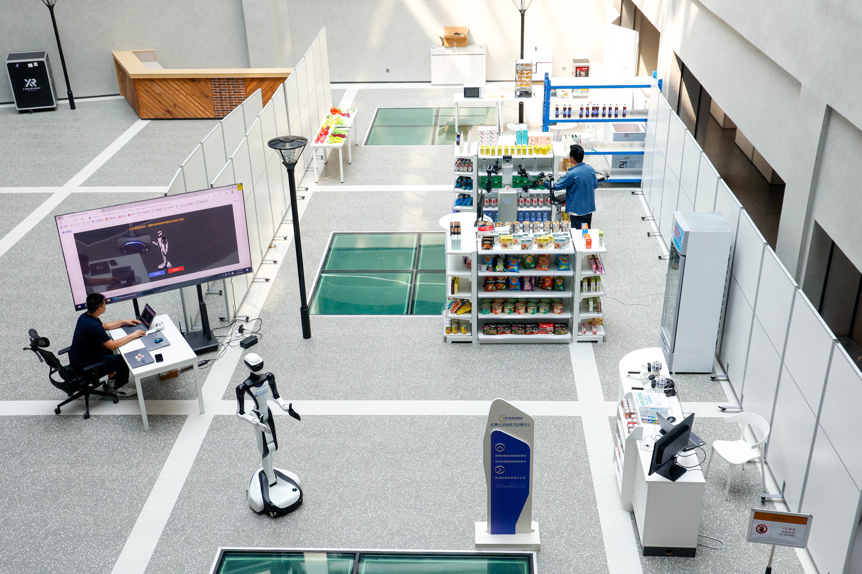走進這些“學校”中,就像是走進了一個沉浸式的實驗舞臺:傳統的教室變成了超市貨架、工廠生產線、餐廳等商業場景,機器人將在這里學習搬運、補貨、上下貨等任務。