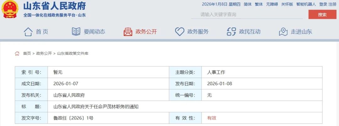 山東省人民政府 關(guān)于任命尹茂林職務(wù)的通知 魯政任〔2026〕1號 省交通運輸廳: 山東省人民政府決定,任命: 尹茂林為山東省交通運輸廳副廳長(試用期一年)。 山東省人民政府 2026年1月7日 |