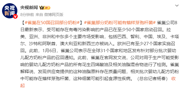 雀巢嬰幼兒配方奶粉的全球召回范圍進一步擴大。總部位于瑞士的雀巢公司當地時間8日表示,受可能存在有毒污染影響的產品已在至少50個國家和地區啟動召回,較此前公布的30多個國家和地區明顯增加。