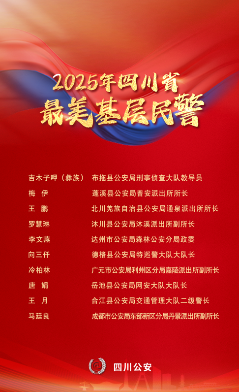 經過多輪推薦和評審,中共四川省委宣傳部、四川省公安廳決定授予涼山州布拖縣公安局吉木子呷、遂寧市蓬溪縣公安局梅伊、綿陽市北川羌族自治縣公安局王鵬、樂山市沐川縣公安局羅慧琳、達州市公安局李文燕、甘孜州德格縣公安局向三仟、廣元市公安局利州區分局冷柏林、廣安市岳池縣公安局唐娟、瀘州市合江縣公安局王月、成都市公安局東部新區分局馬廷良等10名同志2025年四川省“最美基層民警”稱號。