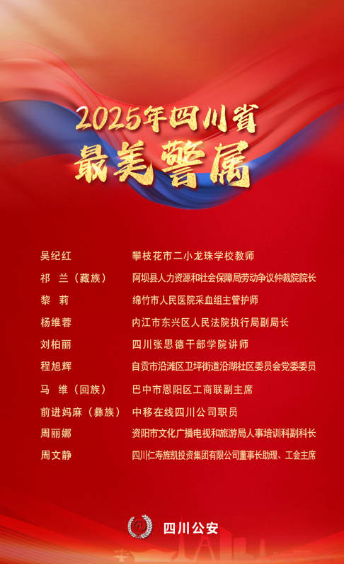 授予攀枝花市二小龍珠學校吳紀紅、阿壩縣人社局祁蘭、綿竹市人民醫院黎莉、內江市東興區人民法院楊維蓉、四川張思德干部學院劉柏麗、自貢市沿灘區沿湖社區程旭輝、巴中市恩陽區工商聯馬維、中移在線四川公司前進媽麻、資陽市文廣旅局周麗娜、四川仁壽旌凱投資集團周文靜等10人2025年四川省“最美警屬”稱號。