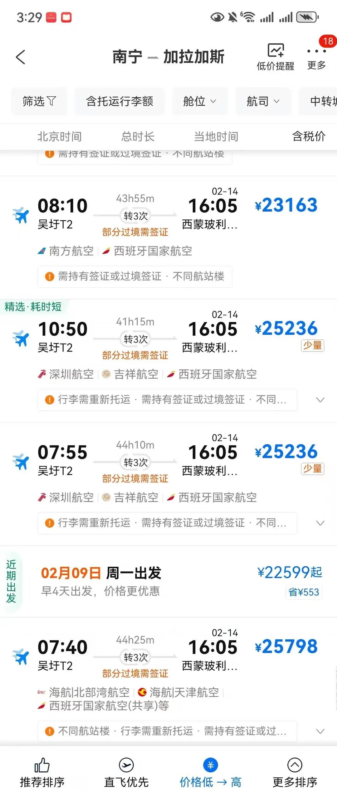 封面新聞記者查詢攜程、飛豬等平臺信息顯示,1月11日后才有中國至加拉加斯的中轉航班,需經西班牙馬德里、卡塔赫納等多地中轉,部分行程需換乘3次,耗時超40小時,價格方面,近一個月內上海、北京等城市至加拉加斯的中轉經濟艙票價在6000元至2萬余元不等,價格波動較大。不少受訪者表示,中轉旅客需辦理西班牙、意大利等中轉國的過境或入境簽證,流程復雜且耗時,成為出行的主要障礙 。