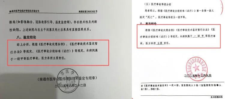 2025年12月9日,江蘇省醫(yī)學(xué)會(huì)《醫(yī)療事故鑒定書(shū)》顯示,該醫(yī)療事故為一級(jí)甲等。當(dāng)?shù)毓矙C(jī)關(guān)也已對(duì)宋女士家屬報(bào)警的醫(yī)療事故一案立案調(diào)查。