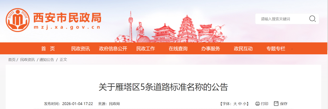 關(guān)于雁塔區(qū)5條道路標(biāo)準(zhǔn)名稱的公告