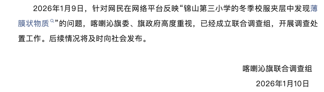 2026年1月9日,針對網民在網絡平臺反映“錦山第三小學的冬季校服夾層中發現薄膜狀物質”的問題,喀喇沁旗委、旗政府高度重視,已經成立聯合調查組,開展調查處置工作。后續情況將及時向社會發布。