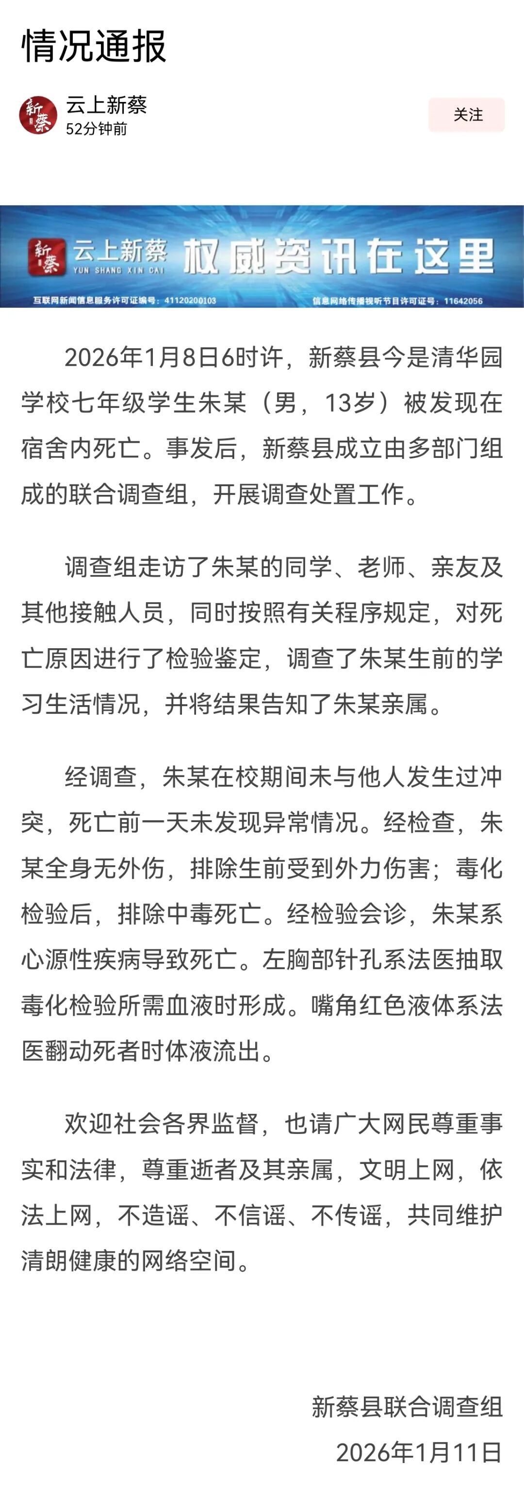 2026年1月8日6時許,新蔡縣今是清華園學校七年級學生朱某(男,13歲)被發現在宿舍內死亡。事發后,新蔡縣成立由多部門組成的聯合調查組,開展調查處置工作。
