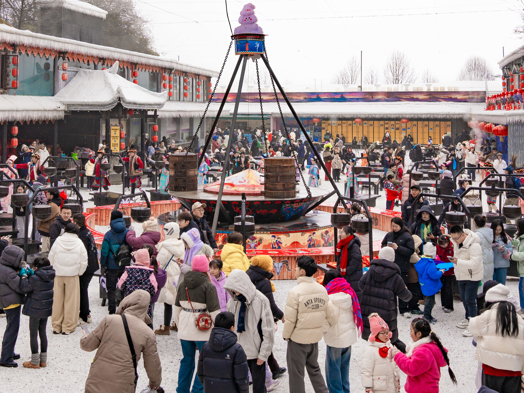 九皇山滑雪場海拔約2000米,冰雪季期間,景區圍繞特色羌文化資源,在羌寨雪鄉每日推出多場民俗展演:傳統羌族婚禮表演、民族歌舞快閃、親子互動劇《姜子牙大戰雪妖》等節目輪番上演,融合多個打卡點打造別樣羌文化體驗場景。在雪鄉市集中,還匯集羌宴刨湯、雪地火鍋、罐罐烤奶等特色美食。游客也可在暢玩冰雪之后前往高山溫泉室,感受“冰雪之后,暖泉之中”的獨特舒緩體驗。