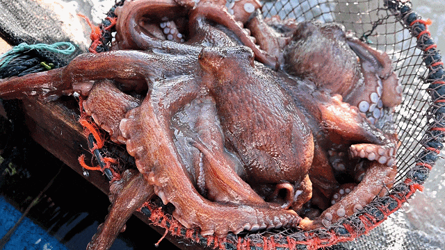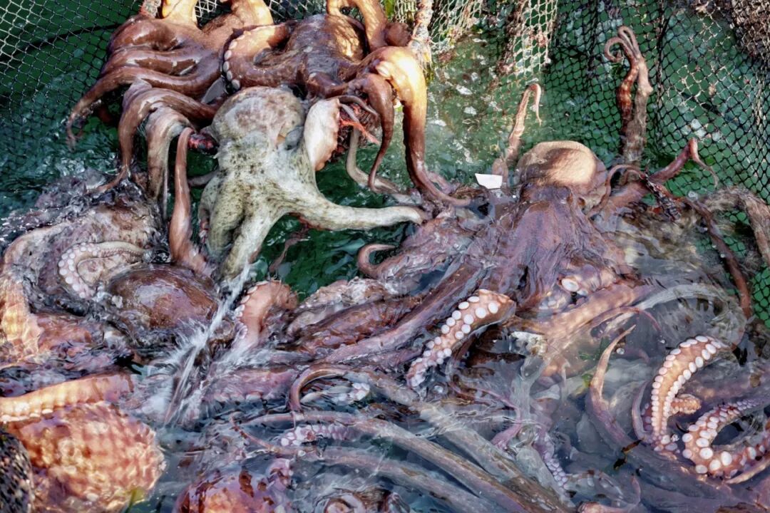 隨著漁網(wǎng)緩緩收緊,成群的章魚浮出水面。漁民們相互配合,用網(wǎng)兜將一頭頭體型飽滿、色澤鮮亮的章魚打撈至活水運輸船中。
