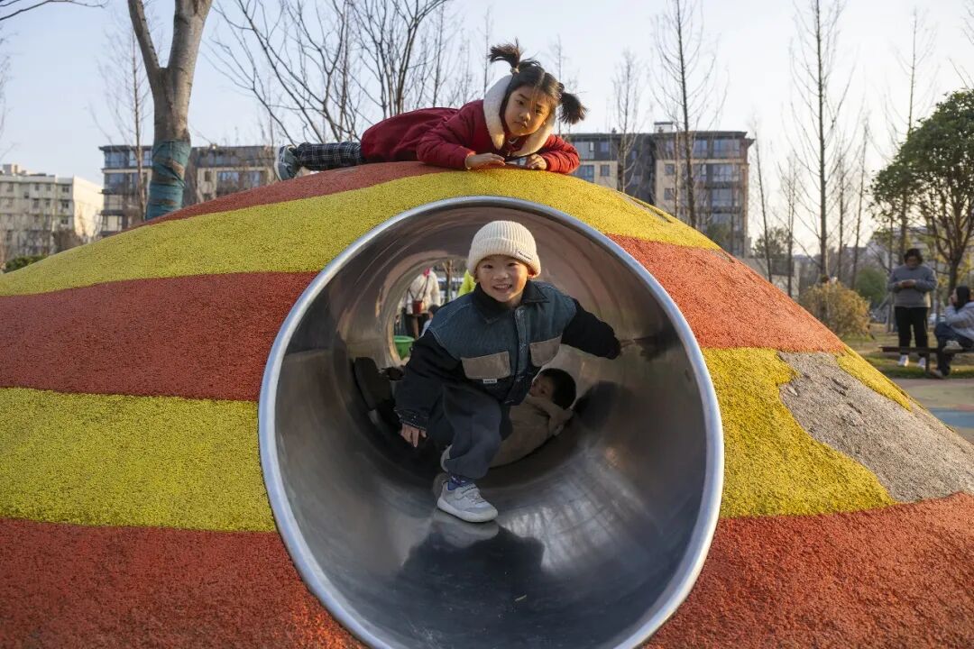 安徽省蕪湖市鏡湖區(qū)借城市更新與老舊小區(qū)改造之機(jī),將北門(mén)口社區(qū)內(nèi)的原蕪湖市縫紉機(jī)廠地塊升級(jí)改造為九蓮塘公園,新增兒童游樂(lè)場(chǎng)、健身場(chǎng)地及便民停車(chē)位,與蕪湖古城無(wú)縫銜接,構(gòu)建“15分鐘生活圈”。圖為小朋友在九蓮塘公園里玩耍。肖本祥 攝